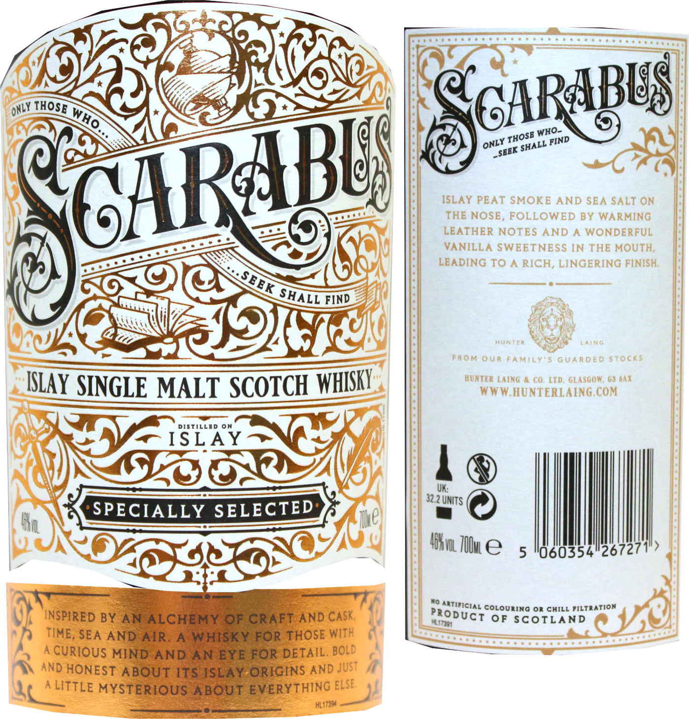 Scarabus tasting notes read "Aromas of Islay peat smoke and sea salt, followed by warming leather notes, stewed rhubarb and a wonderful vanilla sweetness on the palate, leading to a rich lingering finish."